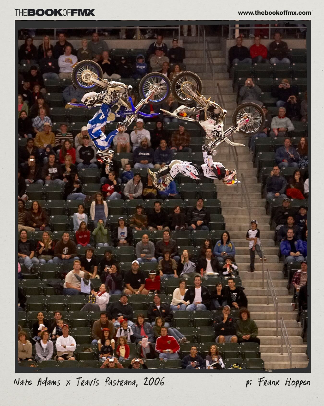 Two icons, flying by upside down. @nateadams741 with the Can-Can Flip and @travispastrana with a Superman Flip at Jeremy McGrath’s Invitational 2006. Photo: @assihoppen Go back Blake ‘Bilko’ Williams, Summer X Games 2006 The Book of FMX Cover Concept